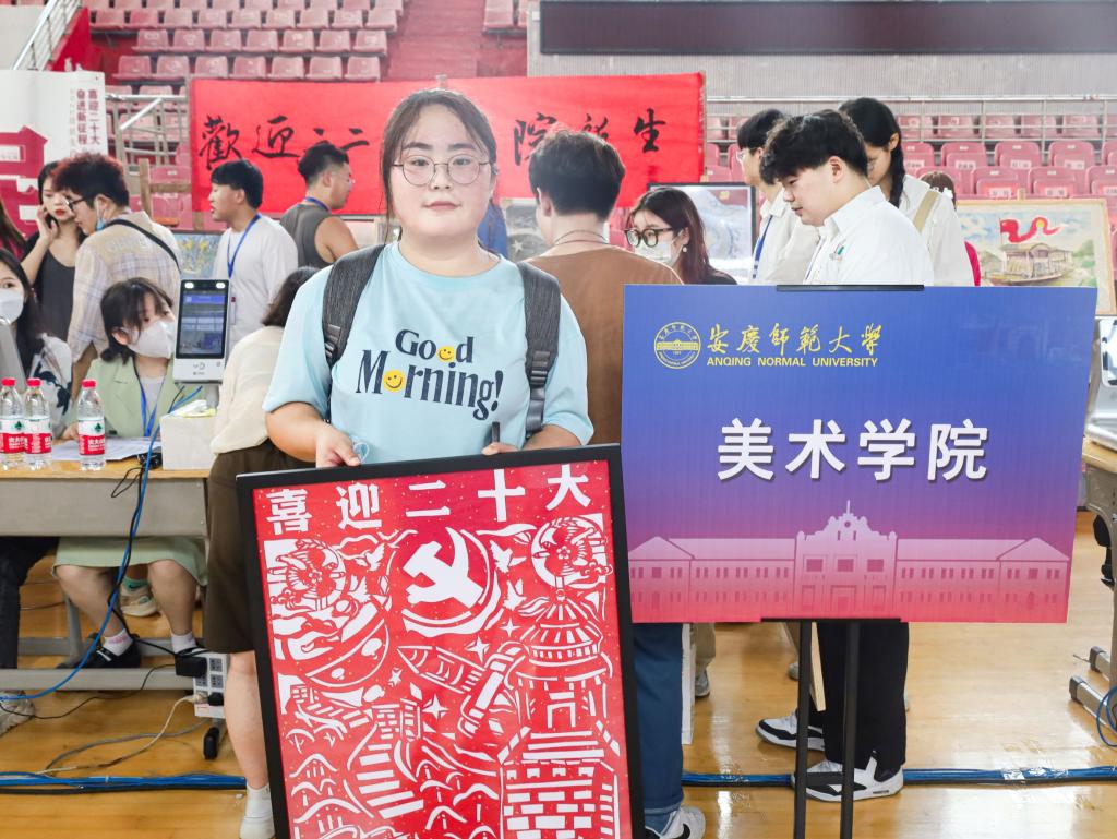 红色剪纸勾勒出蜿蜒壮阔的长城、蓄势待发的火箭;黑色铅笔描绘出疫情当前,国人众志成城、勇担使命;彩色油画棒渲染出形似蛟龙的高铁、筑梦苍穹的宇航员……9月9日,以“喜迎二十大,奋进新征程”为创作主题的270余件作品在龙山校区体育馆与英国上市公司365教学楼展出,为学校迎新现场增添了一道靓丽的风景线。