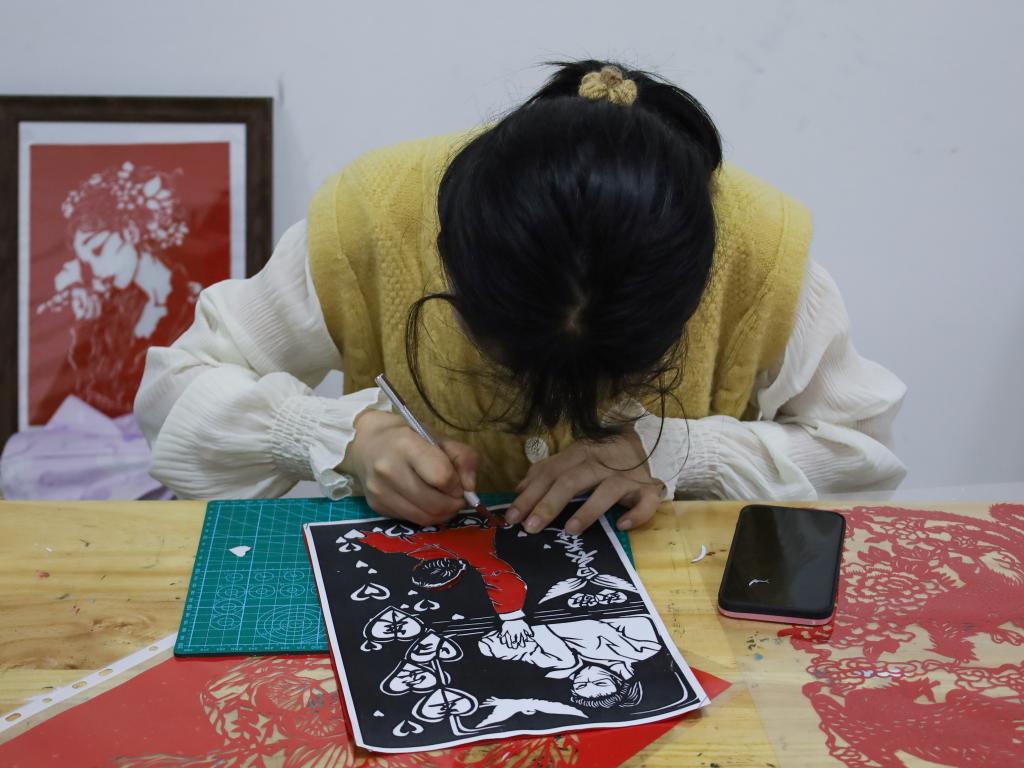 “你要将白色部分用刻刀刻除,留下黑色部分。”美术学专业2021(3)班的罗会学是剪纸俱乐部的成员之一,在本次体验活动中也充当着同学们的“小老师”,她时刻关注着体验剪纸的同学,并不时提供帮助。“这样的体验十分新奇。”她表示,今天从学习者变成教学者,自己不仅进一步掌握了剪纸的能力,还帮助了他人,看到同学们收获成品时的喜悦,自己也很有成就感。