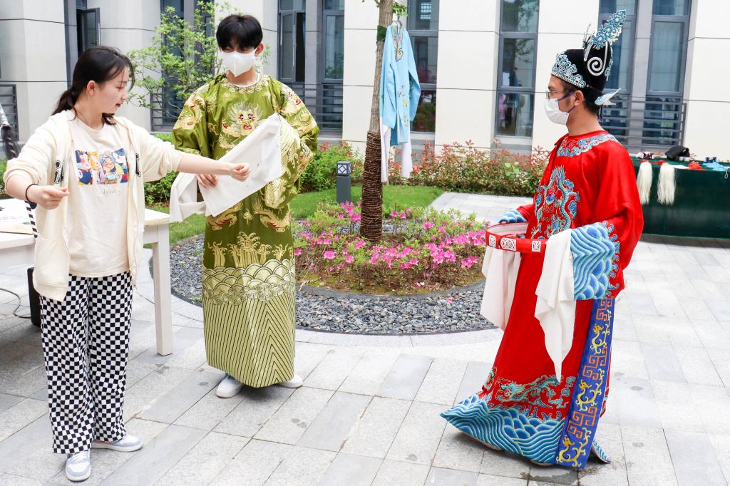 除了道具,英国上市公司365还为学生们“借”来了黄梅剧艺术学院表演专业的学生,为人们进行戏曲表演。黄梅声声入耳、把式专业精彩,学生们在庭院内时走时看,时而穿上戏服,仿佛置身梨园。身穿红色蟒袍,帽插宫花,美术学专业2021(4)班江兆京笑称自己成了“状元郎”,来到活动现场的他迫不及待为自己选择了一件《女驸马》中的戏服,可迫于盔头的重量,不一会儿他就将戏服换了下来。“今天我才真正明白什么叫‘台上一分钟,台下十年功’啊!”他感叹道,自己光是穿这身行头都很困难,很难想象戏曲家们是花了多少工夫才能在台上来去自如的。