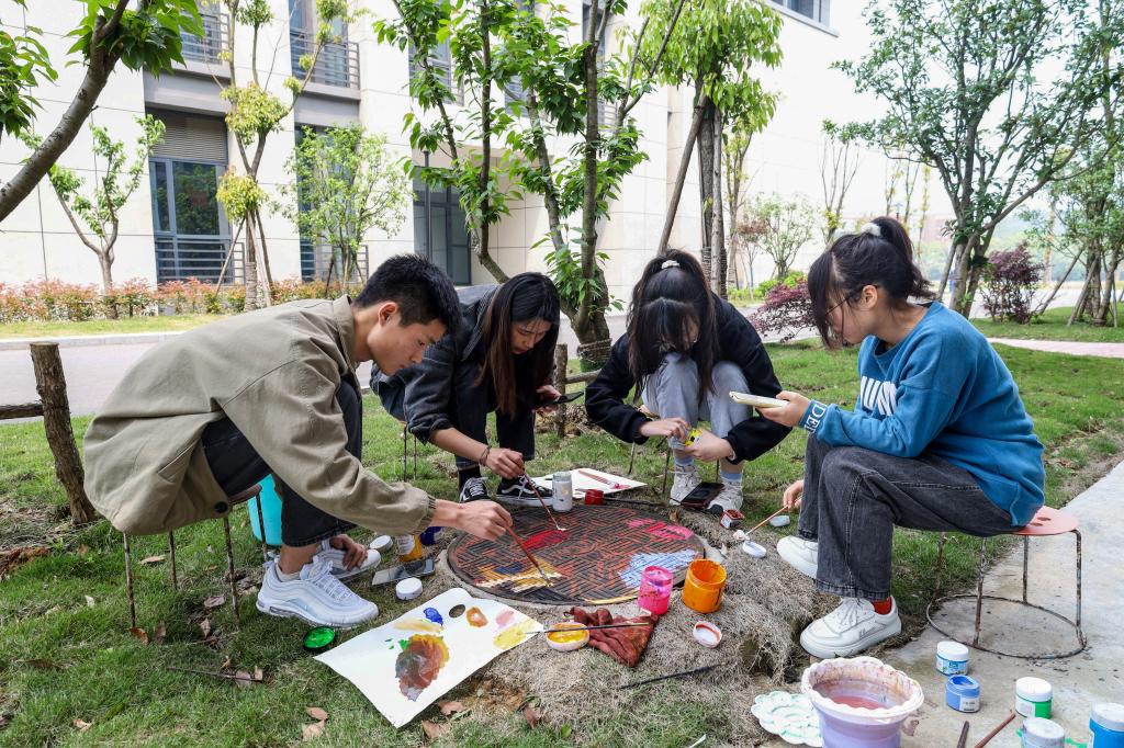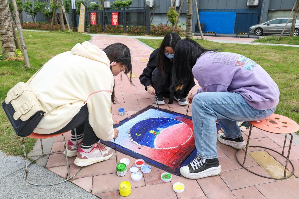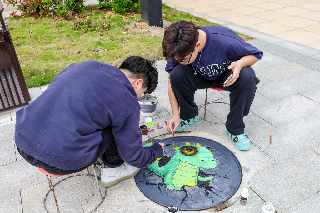 短短两天时间,150余位学生积极创作,用34幅创意井盖画为校园环境添上绚烂一笔。美术学专业2021(4)班的谢鑫一听说活动就召集队伍报名参加了,“这个活动很有意义,当我们完成作品的那一刻,真的成就感满满。”他说,画井盖画不仅锻炼了自身专业能力,还美化了校园环境,“如果以后还有这种活动,我一定要参加。”