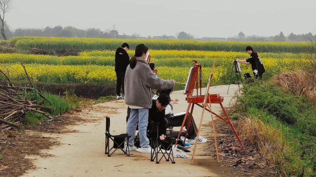 “我们早上七点在润博餐厅集合,然后出发前往望江县油菜花田。”动画专业2019级的陈晨介绍。到达目的地后,同学们开始各自分工:带了画板的同学架起画架,找到一个舒适的位置,构思作图;身着汉服、洛丽塔等特色服饰的同学走进花田,徜徉花海的同时摆出一个个“美美的造型”;同行的其他同学拿起相机,用镜头定格每一个美好瞬间……