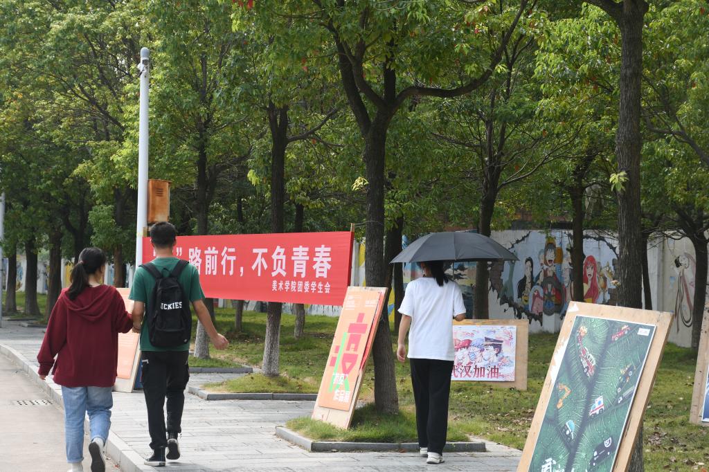 董文慧说,今天第一天开学,在学校保卫处任职的妈妈趁着换班时间带她一起熟悉校园环境时,自己被放在路边的海报作品所吸引。“学长学姐们用专业所学传达着战‘疫’精神,为全民战疫贡献着自己的力量,看到这些作品时我挺有感触的。”她表示,“我会在大学四年认真学习,将来用自己的能力做一个对社会有贡献的人。”