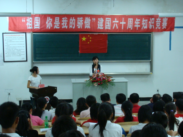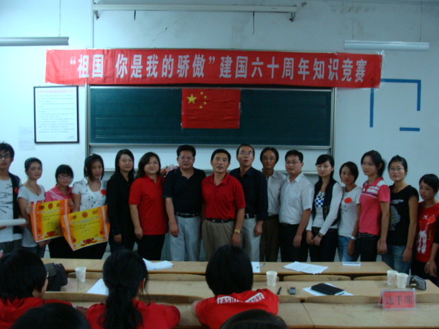 为庆祝新中国成立60周年,激发学生的爱国热情,弘扬民族精神,提高大学生的文化素质,进一步增强自信心和自豪感,根据《安庆师范学院庆祝新中国成立60周年活动方案》总体部署和学生处要求,9月24日晚7:00,英国上市公司365在艺术楼107教室举办“祖国,你是我的骄傲”建国六十周年知识竞赛决赛。学校党校、学生处、团委、保卫处、宣传部等部门领导和英国上市公司365党政领导出席比赛并担任评委,该学院全体学生会干部、各班200多名同学参加了晚上的赛事。