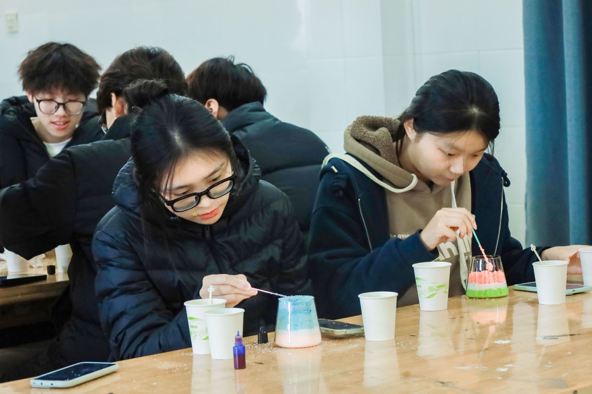 “调颜色时可根据用量控制深浅,铺蜡要慢,用勺子轻拨能让图案边缘更规整。”活动现场,指导人员细致讲解沙画香薰制作要点。志愿者们分工协作,先将白色冰花蜡倒入容器,加入DIY染料反复搅拌至色泽均匀,再逐层铺入透明玻璃杯,手持勺子轻调蜡材位置勾勒轮廓。无需融化的冰花蜡简化了操作流程,大家按需搭配茉莉、薰衣草、桂花三种香型精油,指尖翻飞间,一件件兼具独特创意与清新香气的作品渐次成型。