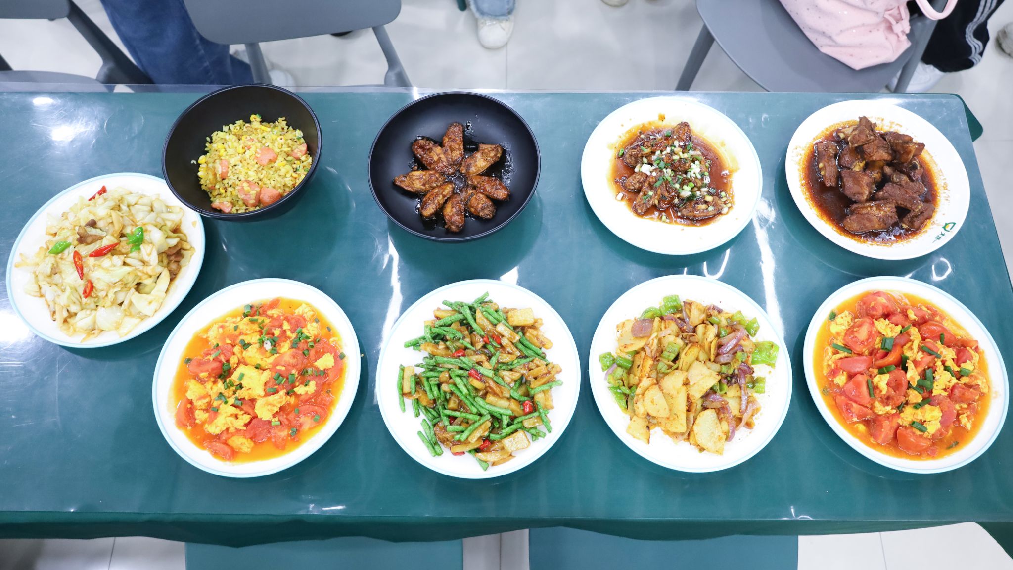 历时一个半小时,可乐鸡翅、西红柿炒鸡蛋、糖醋排骨、土豆炒豆角等菜品相继出锅。大家小心翼翼地将成品摆盘摆放整齐,纷纷拿出手机拍照留念,记录下自己的劳动成果,不少学生还第一时间分享到朋友圈,展示这份亲手制作的“专属美味”。