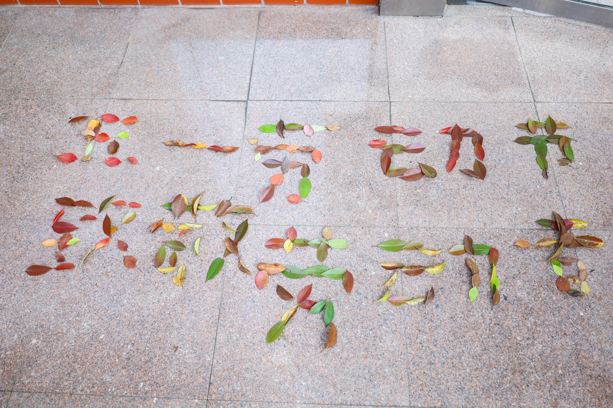 “这里是歪的”“但是也没有这么歪”“‘劳’字上面多加两片叶子吧”……清扫结束后,创作环节正式开始,大家以小组为单位,在空地上构思框架并拼贴,有人负责整体构图,有人专门收集特定颜色的叶片,分工协作间,现场讨论声此起彼伏,随着活动推进,一幅幅富有寓意的主题图案逐渐成型。