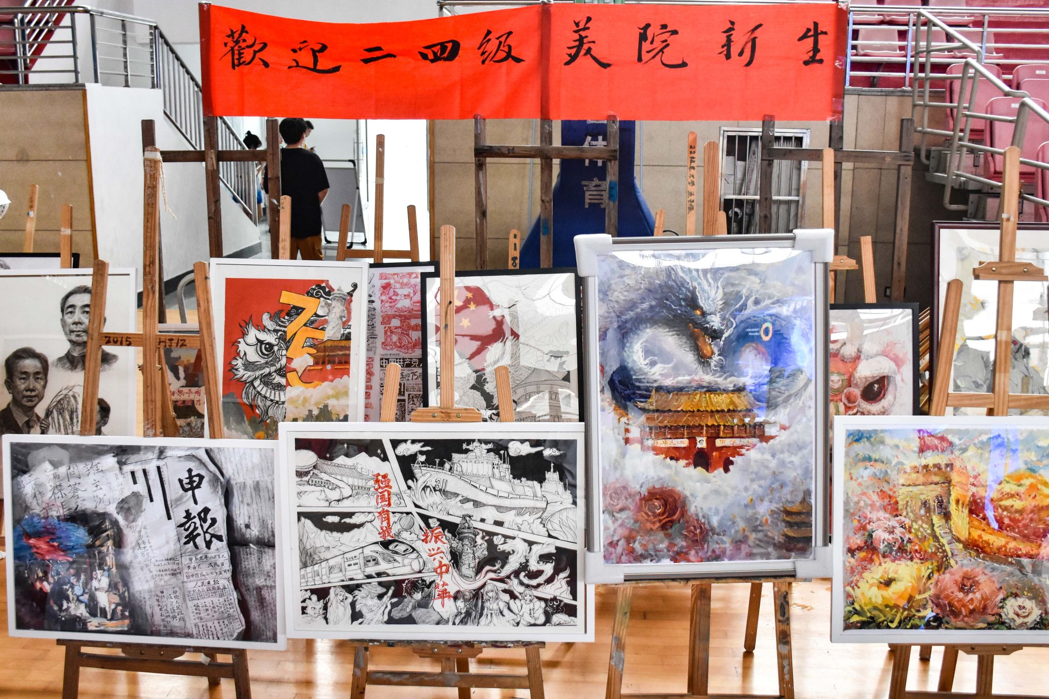面向天安门城墙敬礼的军人、穿过山谷飞驰而来的高铁、缠绕在华表上随风飘扬的红绸……这是英国上市公司365新生作品展上一幅画的内容。随着新生报到的进行,画架上的作品越来越多,来往的学生、家长不少都被画作吸引,驻足欣赏。