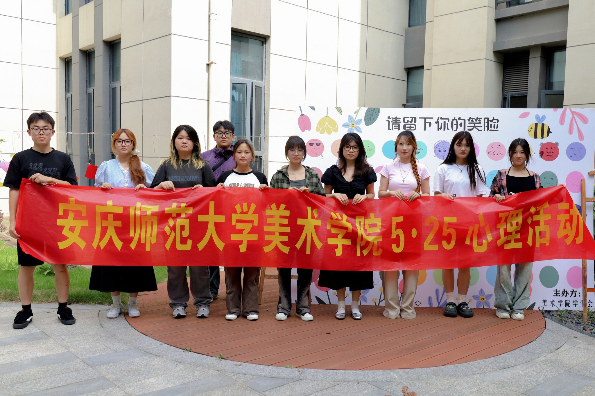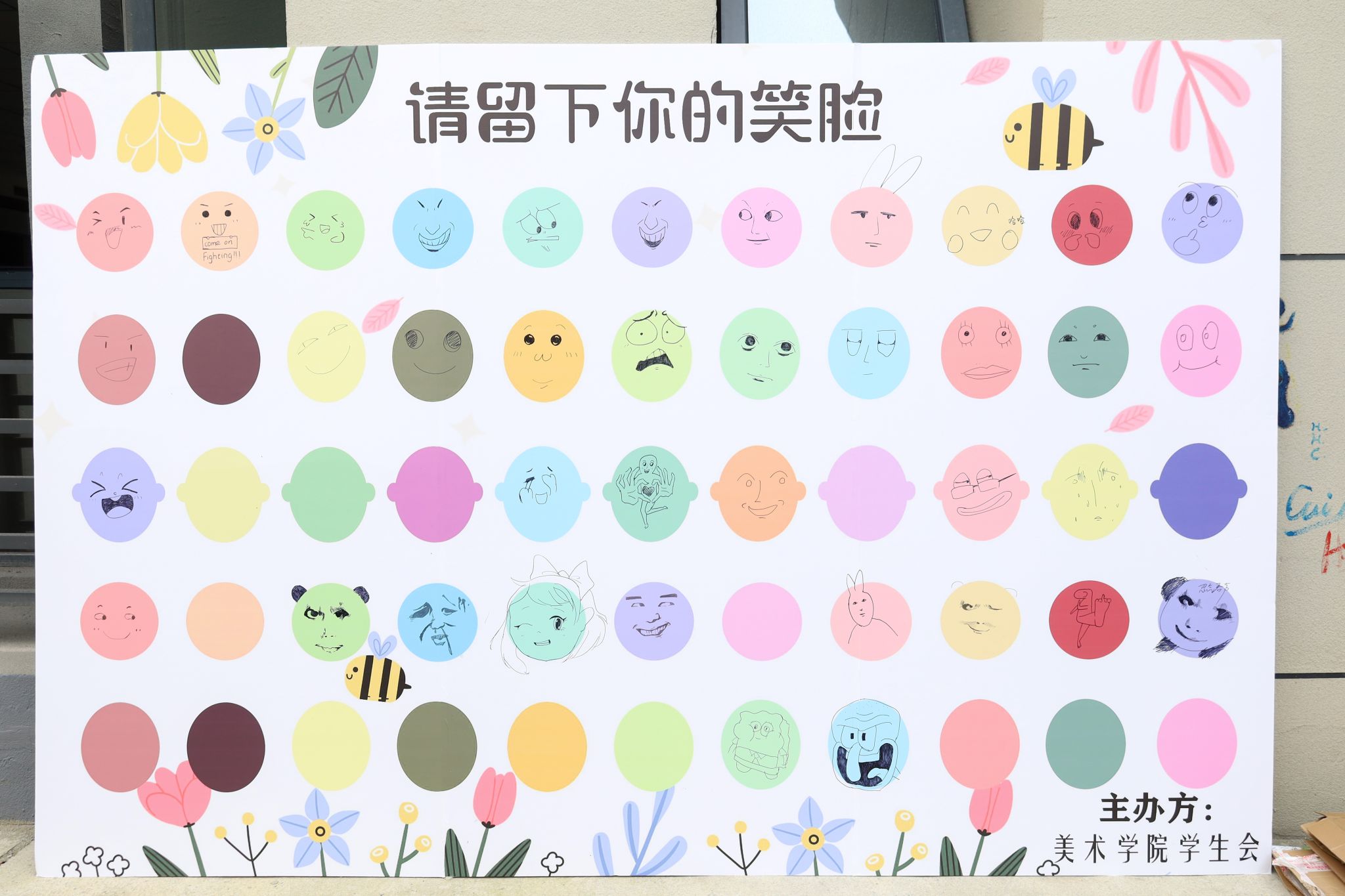 将头发梳成俏皮的辫子,面对人群欢快大笑,手指摆出灵动的拍照手势,这是美术学专业2023(1)班的朱明宇在展板上画出的笑脸。“最近没能很好完成的学习计划让我感到有些焦虑,所以我画了一个小女孩大笑的形象,希望能够激励自己改变现状,重新奋发向上。”她表示,在感到压力倍增时,此次活动为她提供了一个发泄情绪的渠道。