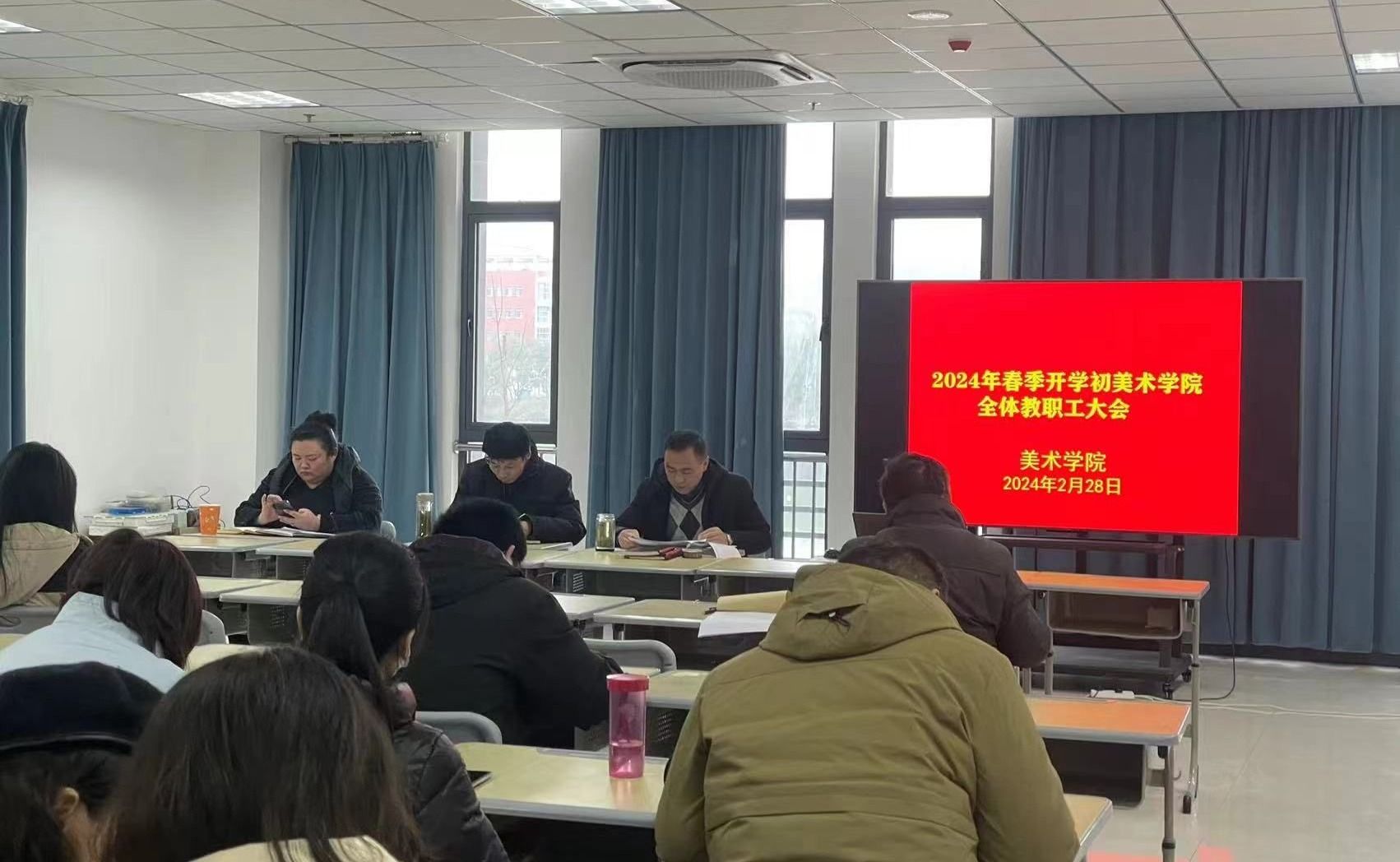 孙根华结合学院实际领学了全国全省教育工作会议重点内容,传达了学校贯彻落实全国全省教育工作会议精神暨2024年度工作部署会主要内容,通报了学院寒假期间工作开展情况,围绕2024年巡察整改、美术学师范专业认证、新一轮本科教育教学审核评估等重点工作提出了具体要求,要“加强学习”,学会运用先进的理论武装头脑、推进工作;要“抓紧落实”,把每项工作落实落细、做实做好;要紧扣“高质量”,切实做到真抓实干提质量、稳重求进谋发展。