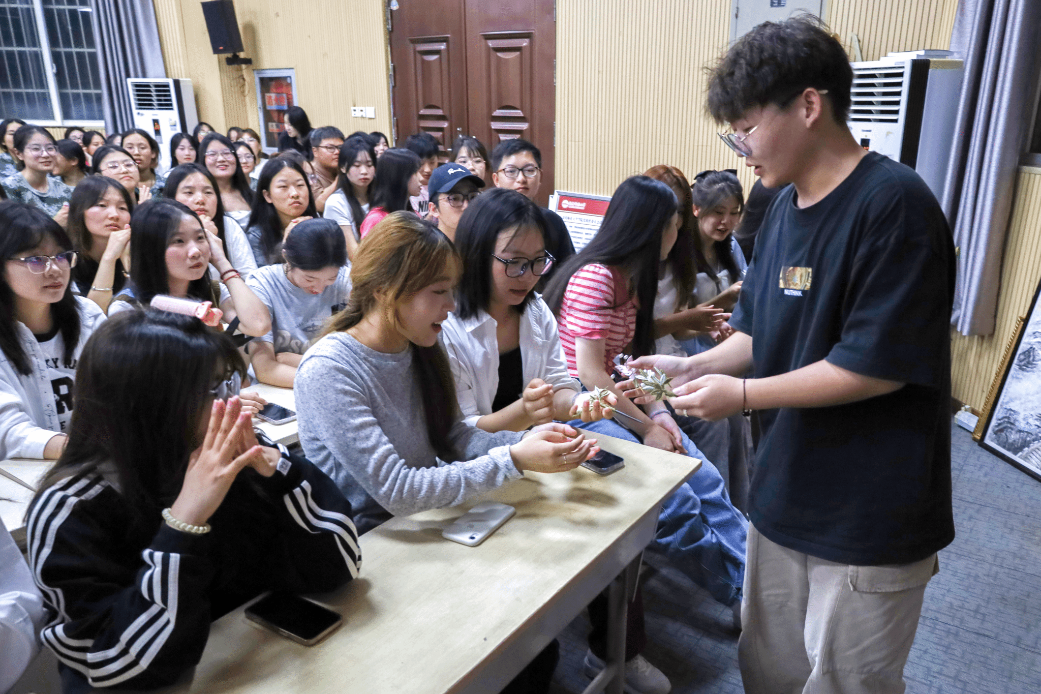 弧形花瓣为主体,配以墨绿色叶片、圆珠做点缀,缠花俱乐部负责人、美术学专业2022(3)班的王鑫带来了11件作品,现场分发给新生观赏。“希望通过缠花展示,召集到更多热爱缠花的小伙伴,将这项民间手艺传承下去。”王鑫表示,缠花不同于其他艺术,需要制作人坐得住、想得深,在学习手工的同时,也要善于挖掘其背后的文化价值。