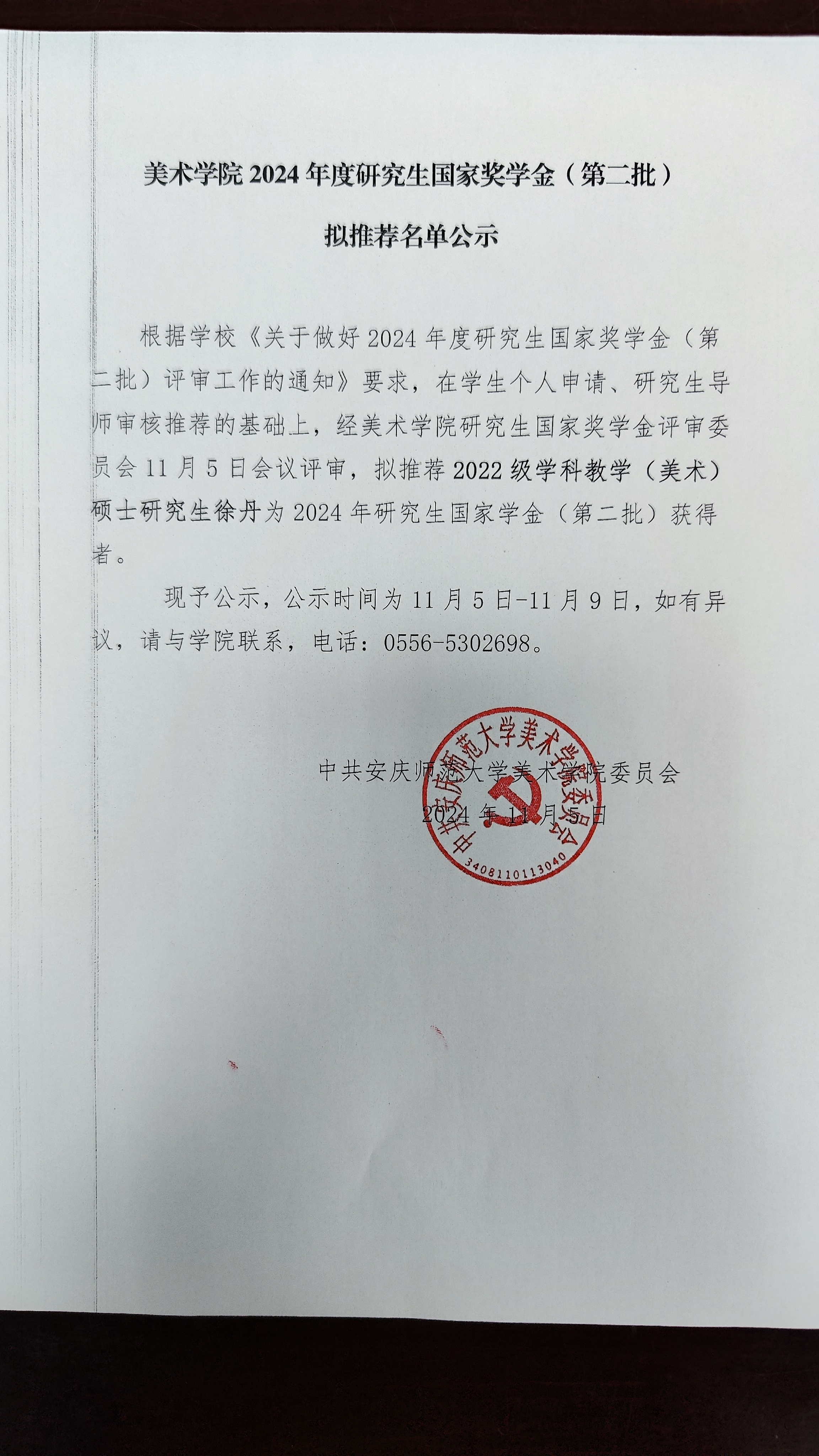 根据学校《关于做好2024年度研究生国家奖学金(第二批)评审工作的通知》要求,在学生个人申请、研究生导师审核推荐的基础上,经英国上市公司365研究生国家奖学金评审委员会11月5日会议评审,拟推荐2022级学科教学(美术)硕士研究生徐丹为2024年研究生国家学金(第二批)获得者。