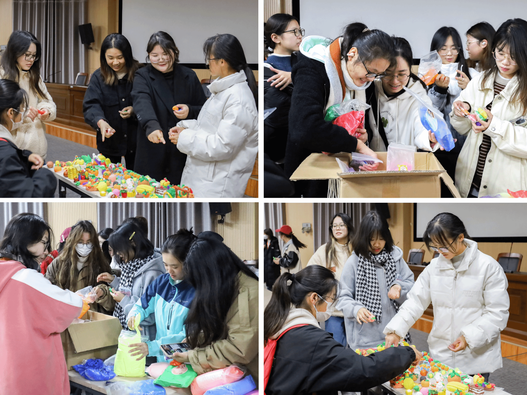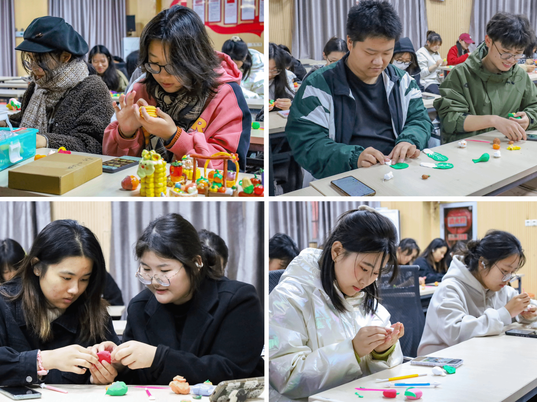 柿子象征“柿柿如意”、板栗果实色泽鲜美、水稻在菜篮边“垂下脑袋”……在学生们的巧手下,各式各样的秋收作物摆在一块,为学院增添了几分秋日气息。院石塑粘土俱乐部的“小老师”们纷纷感叹,在看到最后整齐排列的成品后,她们心中满满都是成就感。