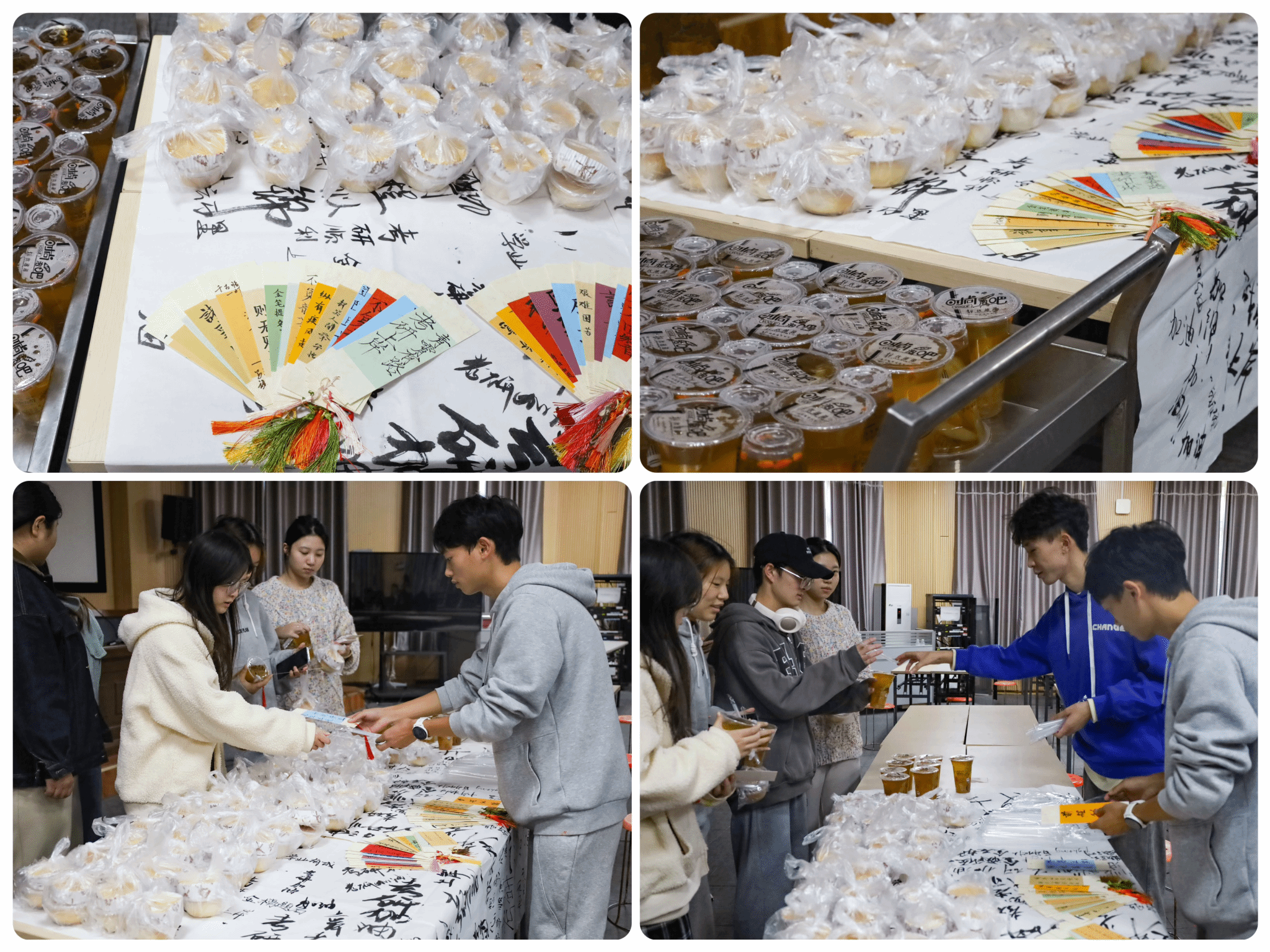 从购买材料到送出礼物,历时半个月,志愿者与学院书法俱乐部的成员共制作出20个折纸书签、40张书法明信片、60杯银耳雪梨羹以及120份烘培面包。“考虑到天气比较干燥,而银耳雪梨羹有滋阴生津、润肺止咳的功效,我们便将它与刚出炉的面包搭配在一起,可以让学长学姐在紧张备考的氛围中缓解一些压力,增强体质。”活动负责人之一、美术学专业2022(1)班的张乐添说。