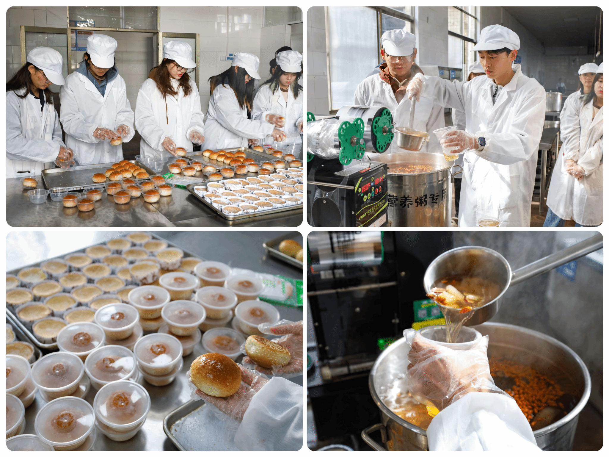 志愿者们到达食堂后厨后,有的掌勺分杯盛放银耳雪梨羹,有的则将刚出烤箱的面包分类装盒、密封包装,最终将它们一并放到小推车内,手携手工礼物,前往图书馆与学院报告厅,为来往的考研学子送去礼包与祝福。“有的学长学姐走路都在看书,希望我们准备的加油礼包可以为他们紧张的生活减去一份压力,带去一份温暖。”设计学类专业2023(3)班的高秀英说。