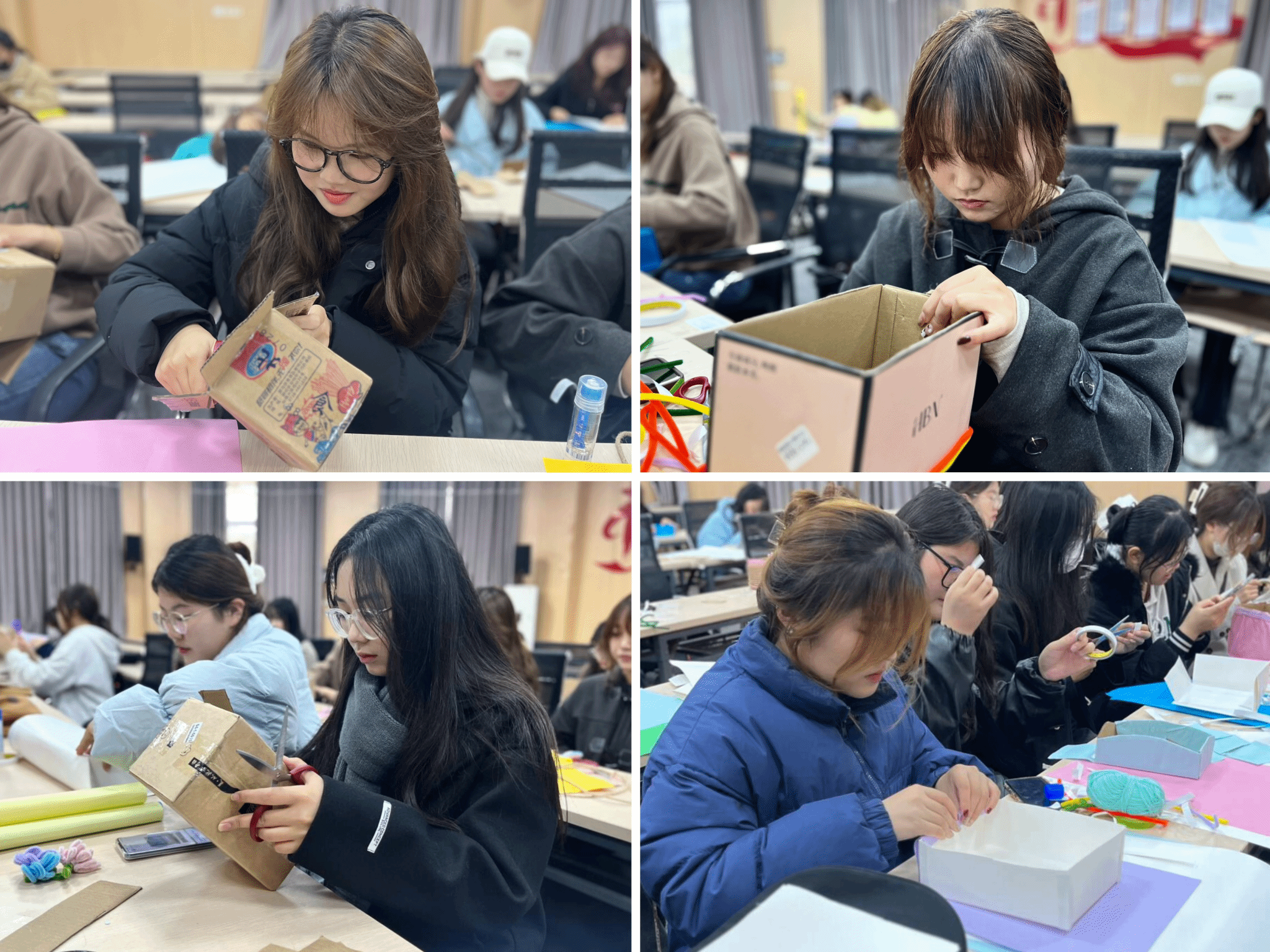 斜插式收纳盒、多层收纳盒、小型粉笔收纳盒……巧手舞动中,废弃纸盒“摇身一变”成为造型各异、装饰精致的多用途收纳盒。待整理完成后,近40份收纳盒将被放置于学院各个教室,为班级学生送上一份冬日温暖。