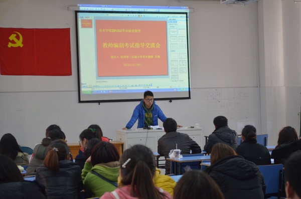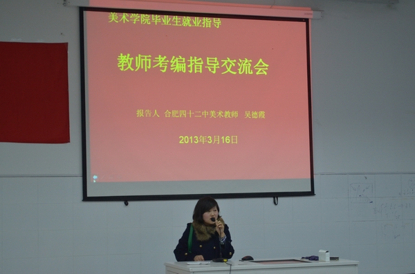 交流会邀请了我院2011届毕业生,来自合肥四十二中的美术教师吴德霞和蚌埠市第三实验小学美术教师吴翔为大家做经验交流和指导。交流会上,两位老师结合各自考编经历,向大家讲述了他们考编的故事。他们一致认为,考编之路虽然辛苦,但一定要明确目标,坚定信心,要怀有一颗坚强的心,才能不畏任何困难和面对各种挑战。他们希望大家在校期间要认真学习专业基础课,努力掌握师范生说课、无生授课、三字一话、教学设计等基本技能;另外,在“专”的基础上还要做到“通”,要熟悉和掌握一些公共基础知识;要认真分析各地招考通知的异同,有针对性的开展复习备考。针对同学们顾忌考编中的人为因素,两位学长告诉大家教师招考各环节都是公开公平,大家要认真准备,不能把希望寄托在别人身上。对于考编不能一步到位,要做两手准备,做好备选方案,分步达到最终目标。