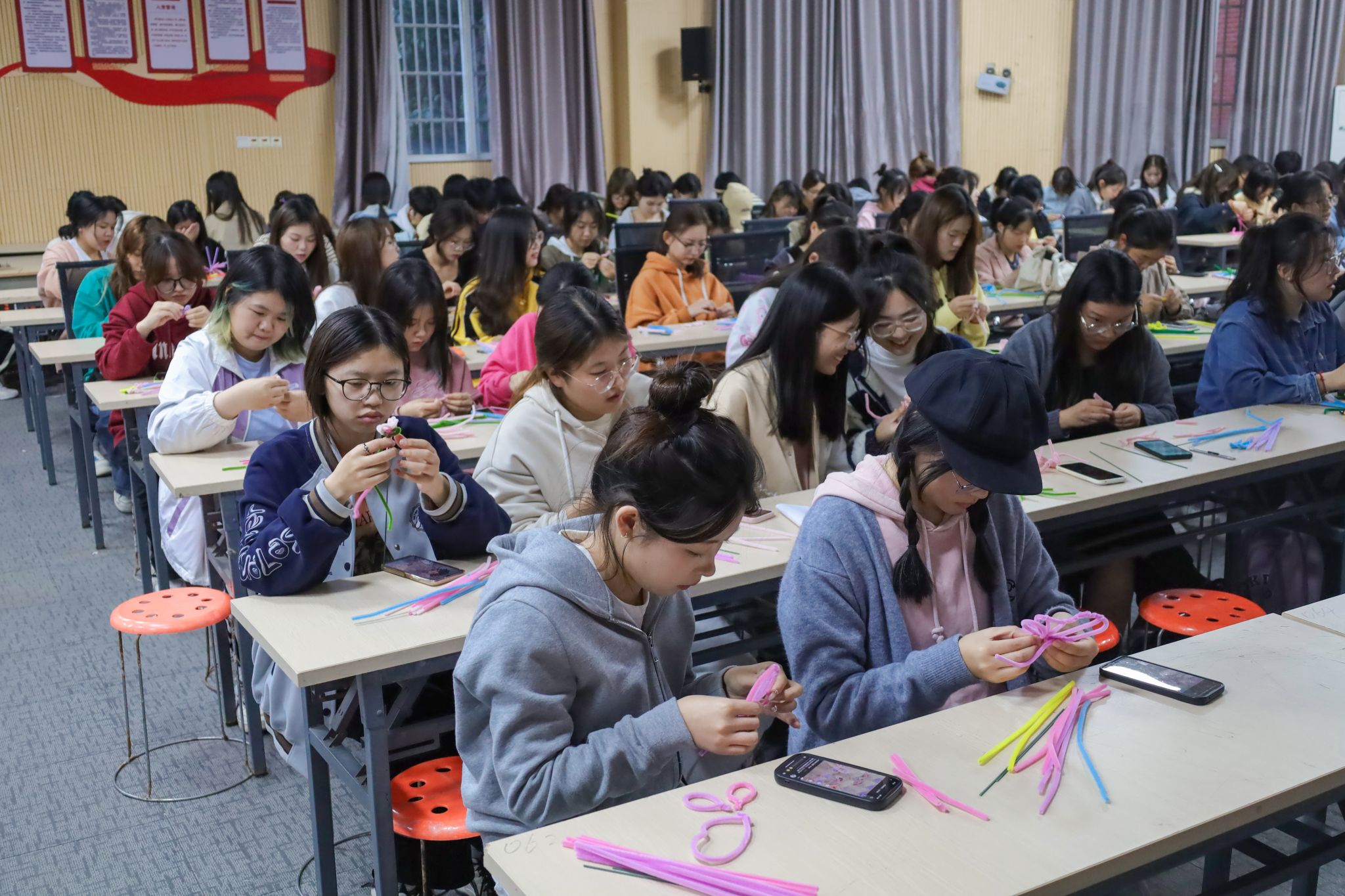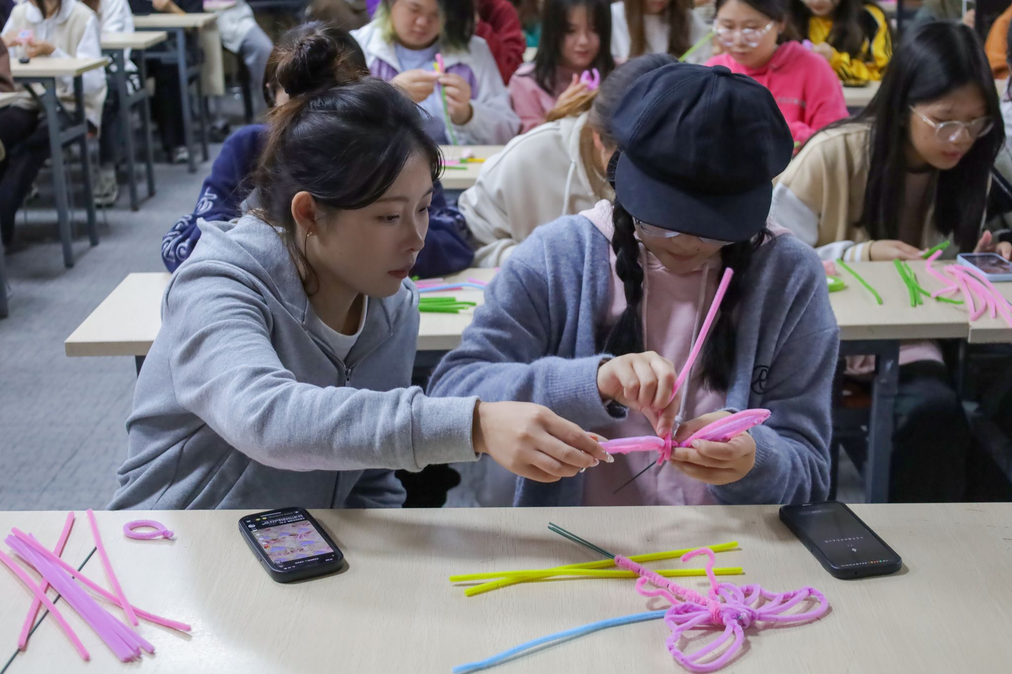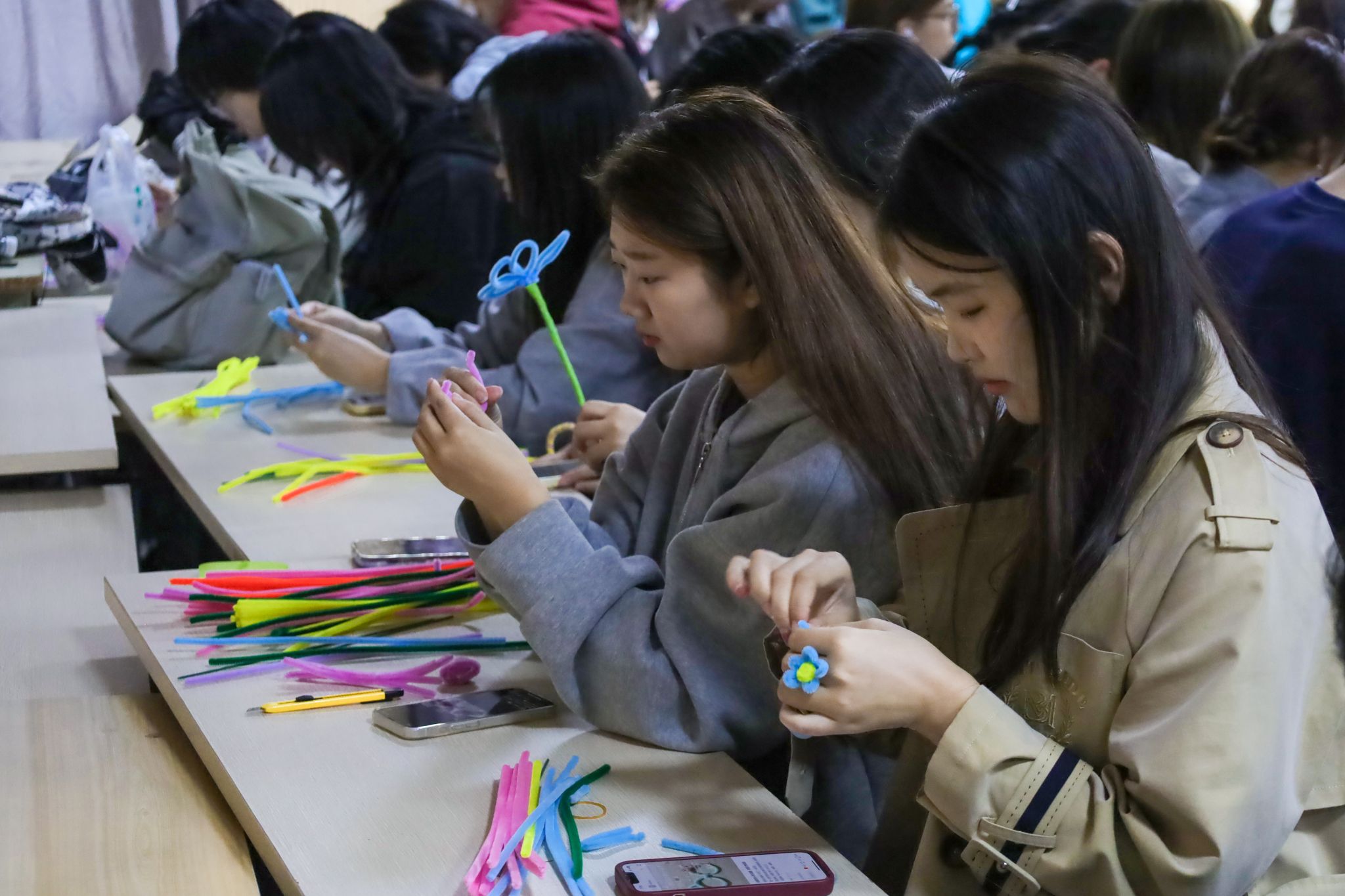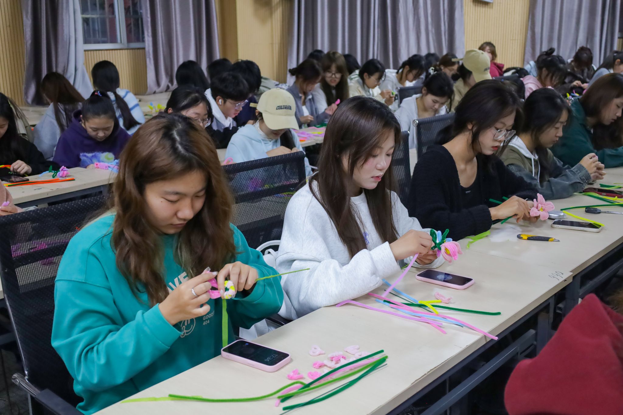 随着学生们手指翻飞,一枝枝娉婷秀美的绣球、花容婥约的郁金香纷纷“争奇斗艳”,色彩柔和、花型各不相同的永生花构成了一道独特的风景线。许多同学用手机记录下自己的手工制品,将这份温暖与成就感分享给亲友。