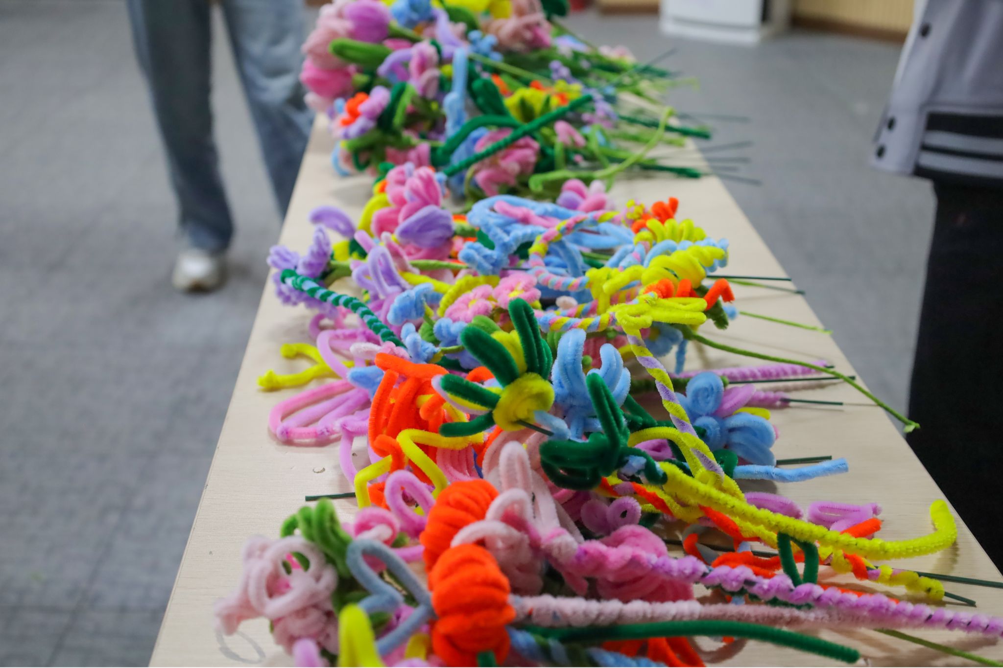 2000根扭扭棒、200根手工花杆、26把剪刀、10卷胶带……早在一周前,活动负责人、设计学专业2022级的单冠瑞便着手准备活动所需材料。他表示,由于鲜花易凋零,所以他将目光转向了可操作性强、成品美观的扭扭棒永生花,希望这些永不凋零的花朵能够始终陪伴老人。