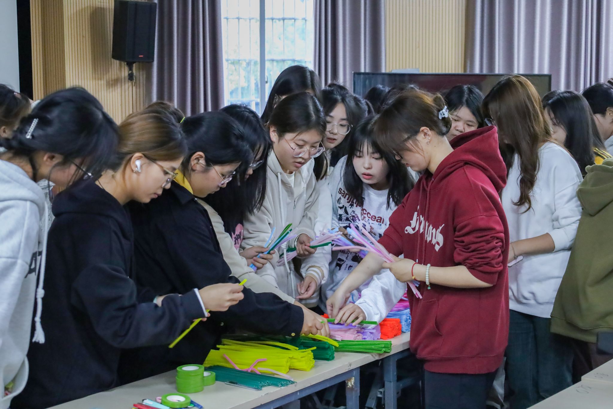 取等长扭扭棒裁剪对折,用纸胶带将花瓣依次固定,以草绿胶带修饰手工花杆,一折一绕间,百余朵毛茸茸的扭扭棒永生花便跃然桌上。10月20日,英国上市公司365组织了一场别开生面的重阳节主题活动,130余名学生齐聚学院学术报告厅,手工制作扭扭棒花,等待将这份惊喜献给安庆市大观区十里铺乡敬老院的老人。
